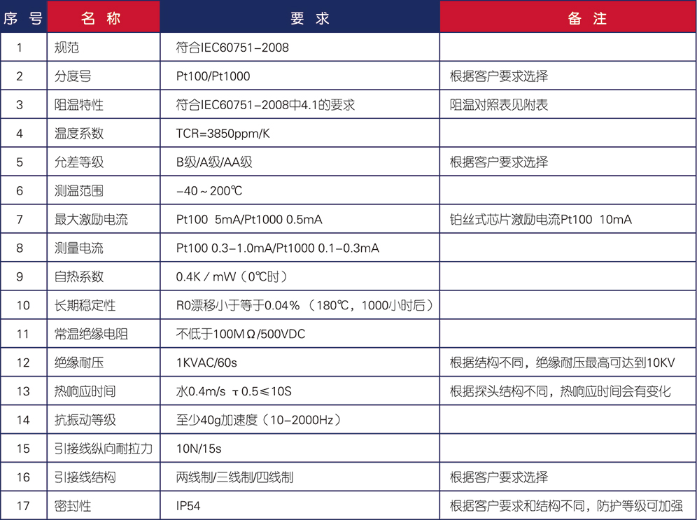 電機(jī)用埋置式電阻是用于電動(dòng)機(jī)、發(fā)電機(jī)繞組的測(cè)溫元件。其感溫材料為常用材料是高精度芯片、3號(hào)鉑絲(代號(hào)Pt3,技術(shù)要求按GB/T5977)。用來(lái)測(cè)量電動(dòng)機(jī),發(fā)電機(jī)鐵芯,線圍繞組、水、油等維度。該產(chǎn)品具有測(cè)量精度高,長(zhǎng)期使用性能穩(wěn)定,高抗震能力強(qiáng)等特點(diǎn)。其感溫元件和引出線焊點(diǎn)處于全封閉狀態(tài),特別適用于F級(jí)無(wú)溶劑漆的相容性要求。 52引用標(biāo)準(zhǔn)JB/T1055.1-2005電機(jī)用埋置式熱電阻第1部分規(guī)定、測(cè)量方法和檢驗(yàn)規(guī)則JB/T10500.2-2005電機(jī)用埋置式熱電阻第2部分:鉑熱電阻技術(shù)要求。
